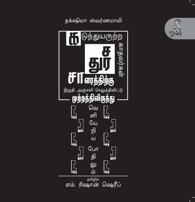 கறுப்பு நிறத்துக்கு இசைவான கடும்பச்சைப் பின்னணியில் ஒரு த�ொகை நந்தியாவட்டைப் பூக்கள் சற்றேனும் அசையாமல் அவளையே பார்த்துக் கொண்டிருந்தன; ஜன்னல் கம்பிகளினூடாக, இரவின் இருள் முற்றத்தை எட்டப்போகும் நேரத்தில். ஜன்னல் சட்டத்தினூடாகத் தென்பட்ட முற்றத்தைச் சூழவுள்ள மொத்த சூழலுமே கறுப்பு நிறத்துக்கு இசைவான கடும்பச்சைப் பின்னணியில் நெருக்கமாகப் பரந்திருந்த வெண்ணிற நந்தியாவட்டைப் பூக்களால் மூடப்பட்டிருந்தது அவளது விழிகளை வேறெதையும் பார்க்க விடாமல். சரியாக கண்மணியின் நடுவில் நந்தியாவட்டைப் பூக்கள் பூத்திருந்தன அவளது ஒரு விழியில் ஒன்றென. ஆறு மணி செய்தியறிக்கை முடிந்ததன் பிறகு ஜன்னல் கதவுகளைத் திறந்து விட்டு ஜன்னலின் சதுரச் சட்டத்துக்கு நேராக அமர்ந்து கொண்ட அவள், வெண்ணிற நந்தியாவட்டைப் பூக்கள் கறுப்புப் பின்னணியிலிருந்து மறைந்து போனதன் பிறகுதான் விழிகளை அதிலிருந்தும் அகற்றினாள்.